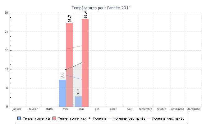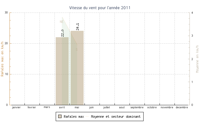 | avril | 8.6 °C | 10.1 °C | 26.7 °C | 18.4 °C | 11.9 °C | 3.8 km/h | 22.0 km/h | NE |